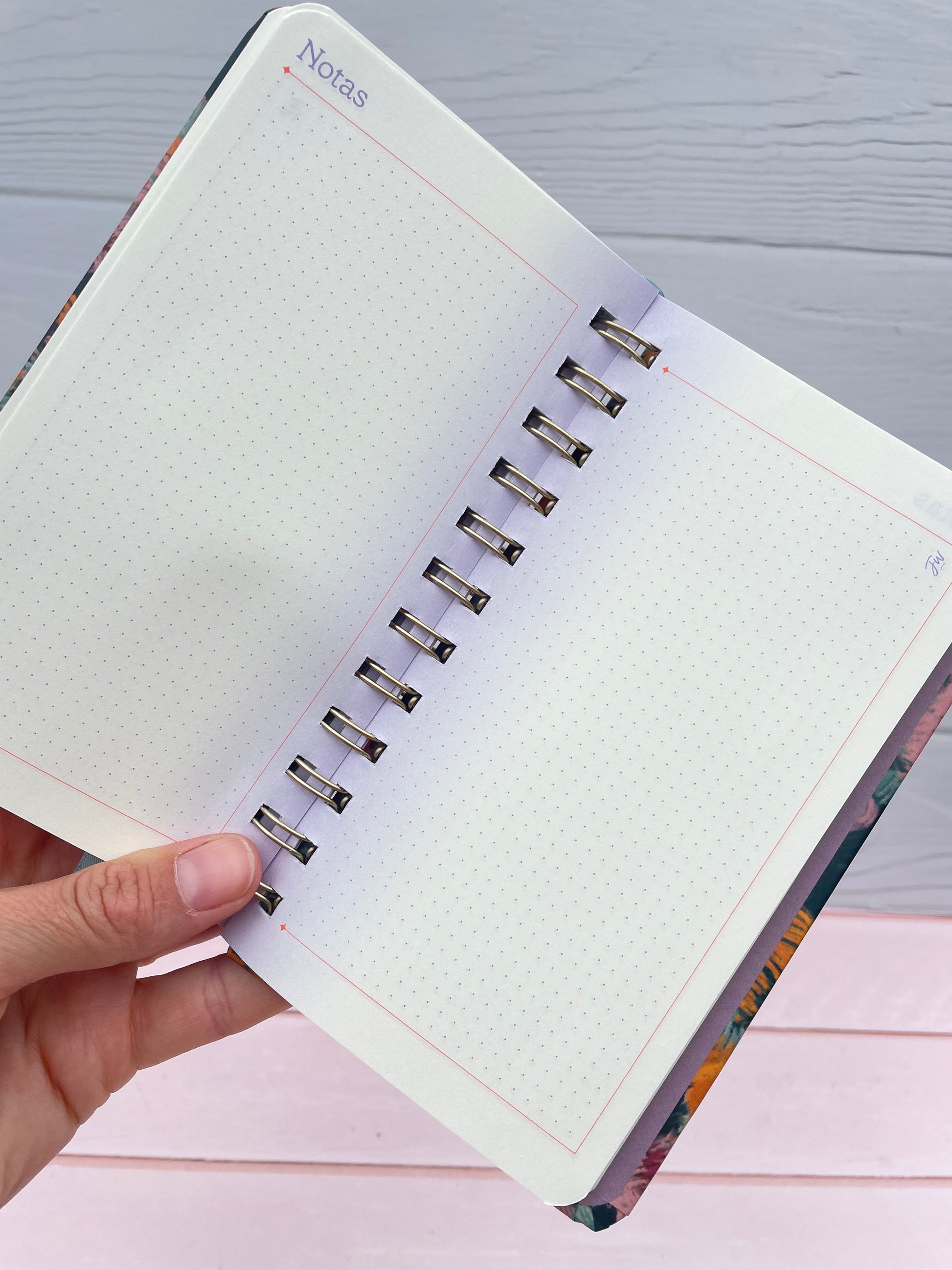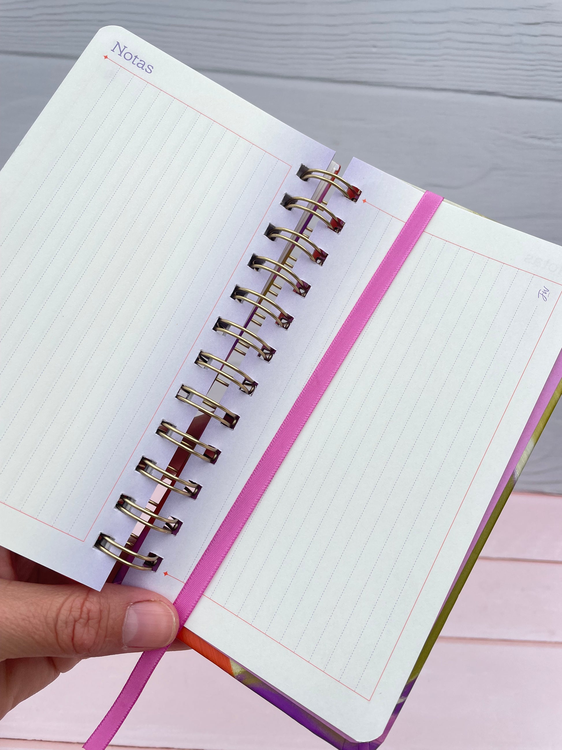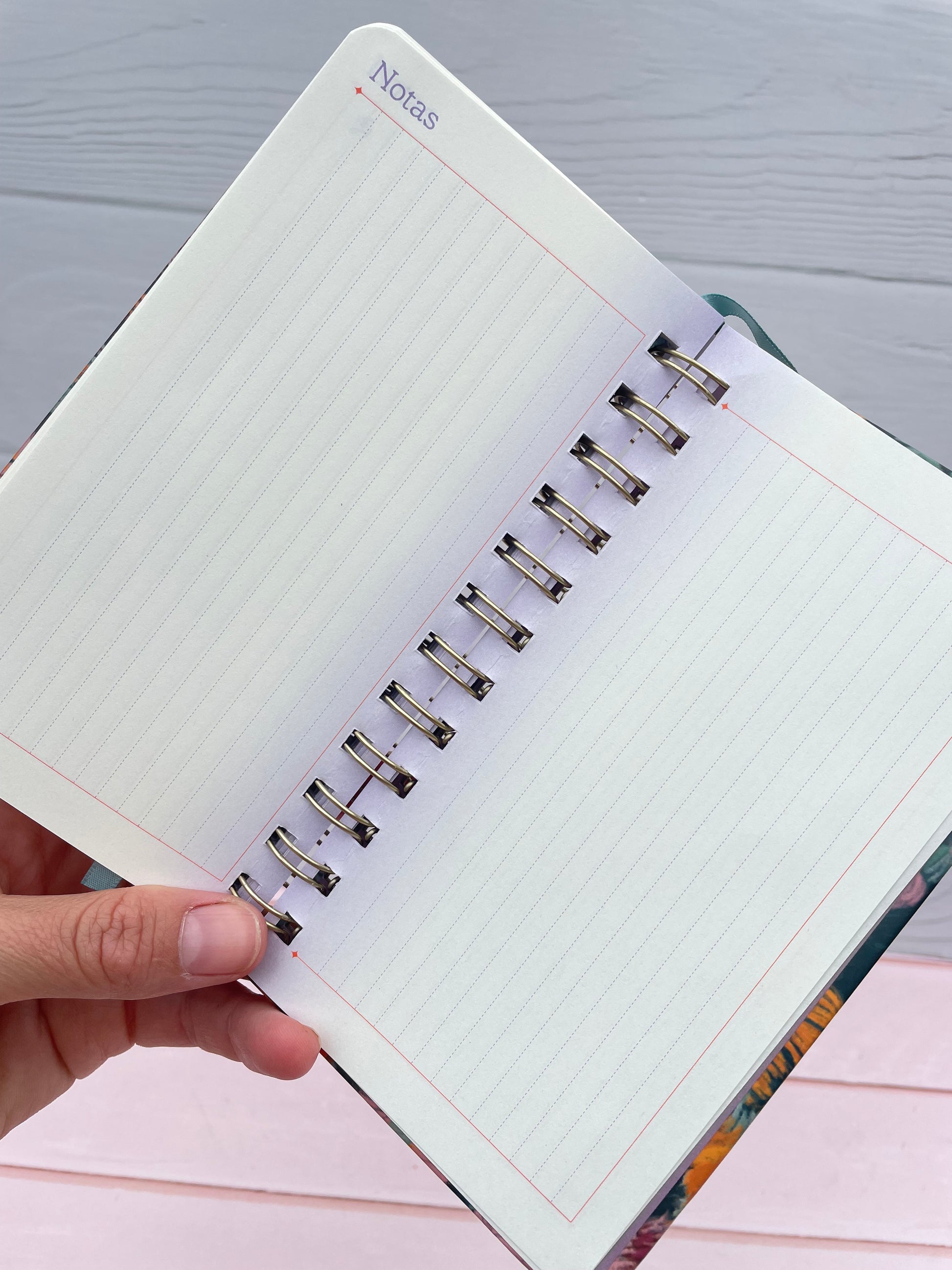 - Tapa dura con rulo metálico y detalles en stamping. Incluye elástico y cinta señaladora.