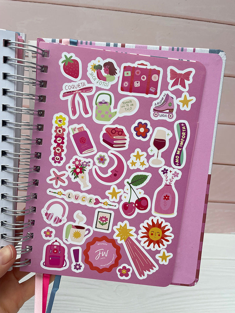 - Contiene 3 planchas de stickers, sobre interno y 3 cintas marca páginas.