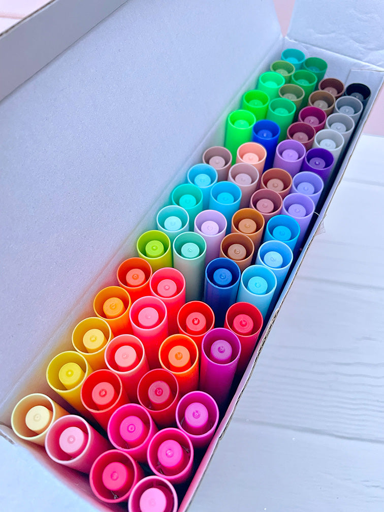 - Cajita con 60 Marcadores gruesos punta cónica, que gracias a su forma permite realizar trazos finos y gruesos.