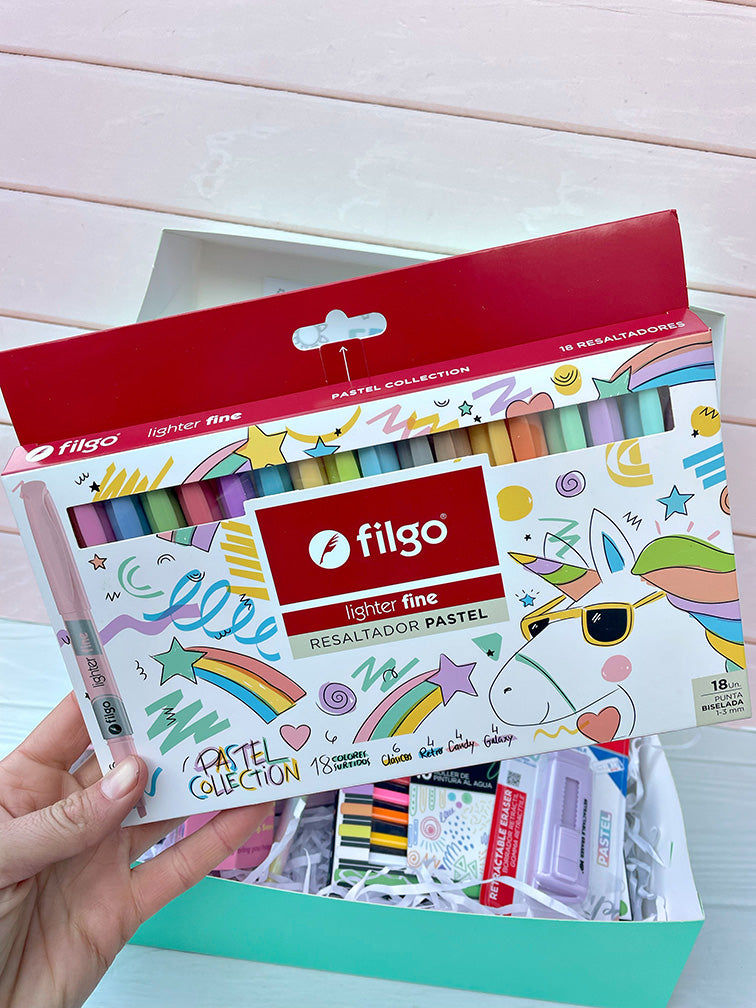 - Cajita con 18 Resaltadores finos pasteles de Filgo.