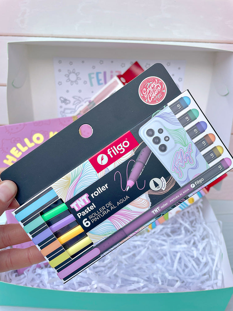 - Cajita con+6 lapiceras roller de Filgo en colores pasteles.