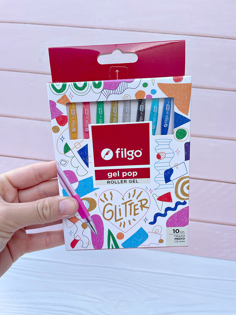 - Cajita Filgo con 10 Lapiceras de Gel Glitter.