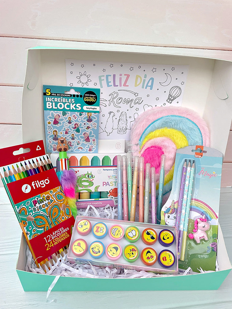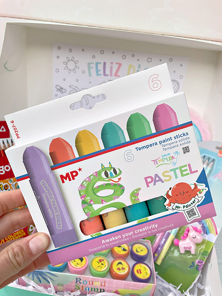 - Cajita con 6 témperas en bastones pasteles.