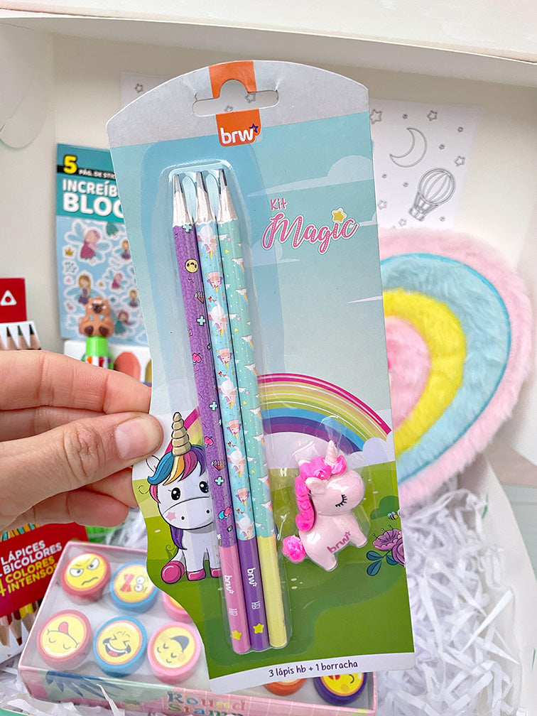 - Set de 3 Lápices + gomita con diseño de unicornio.