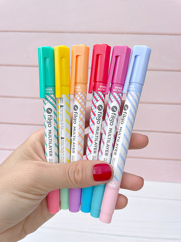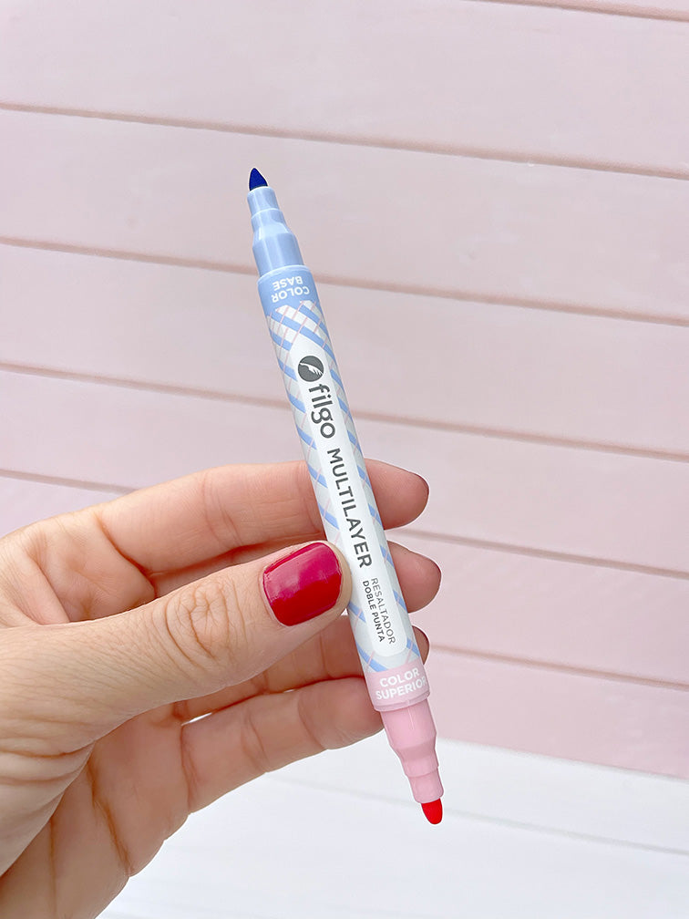 - Una punta es biselada y color de base y la otra es punta fina de 2.0 y es el color superior, que se debe colocar por encima del color base.