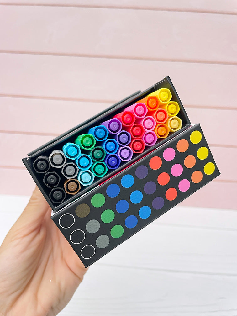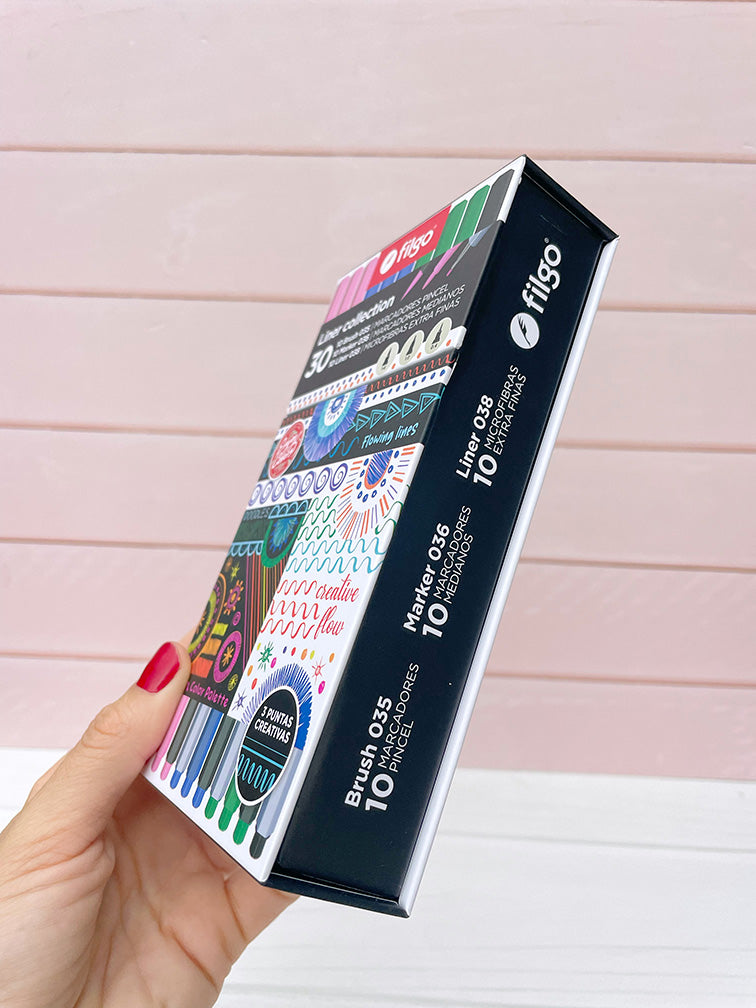 - 10 Microfibras de trazo: 0.4, + 10 Marcadores medianos de trazo1.0, + 10 Marcadores punta pincel fino de trazo 1-6.
