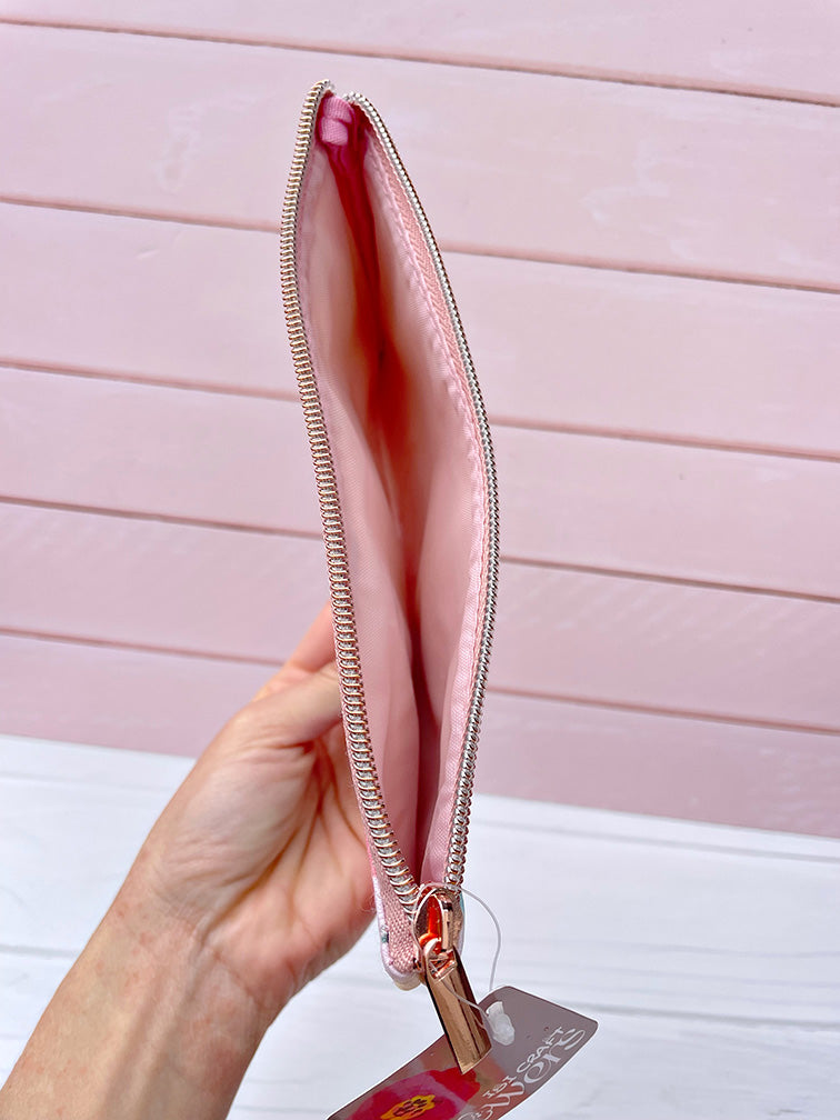 - Estuche/ Cartuchera de ecocuero con diseño de flores, forrado y con cierre metálico en color rosa oro + Planificador semanal tapa dura + Cuadernito Ecocuero con diseño de flores.