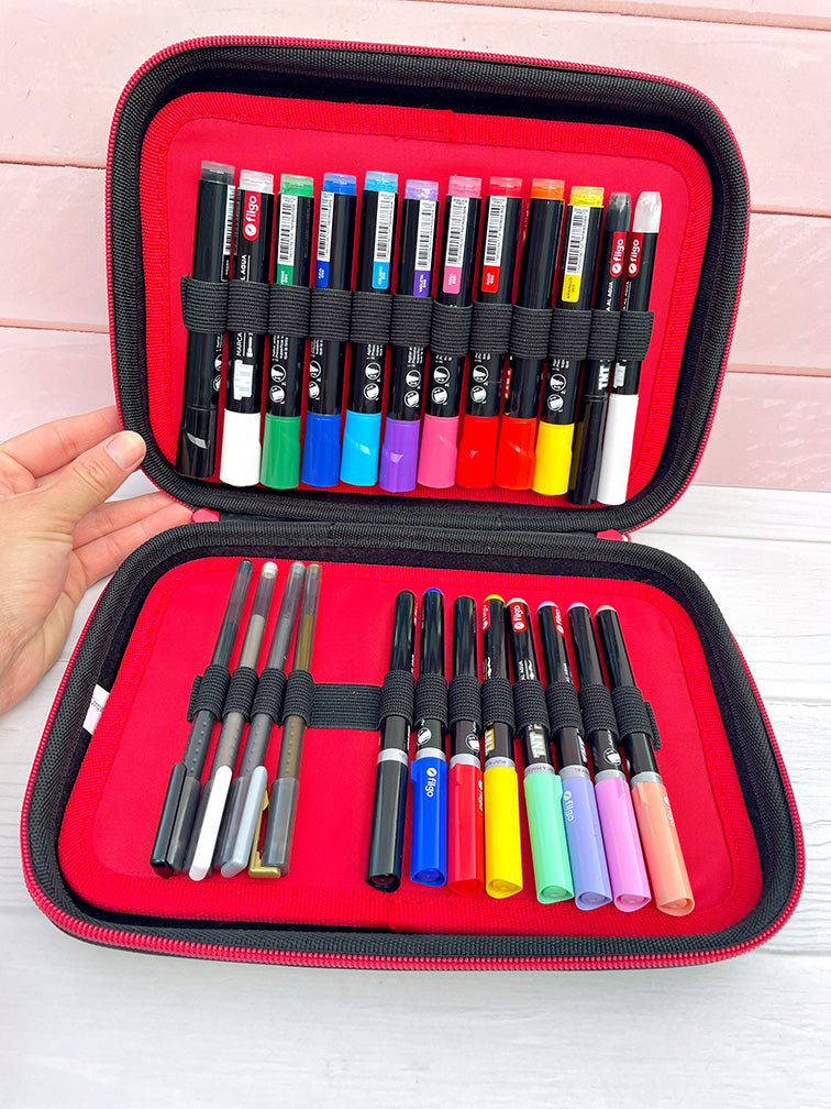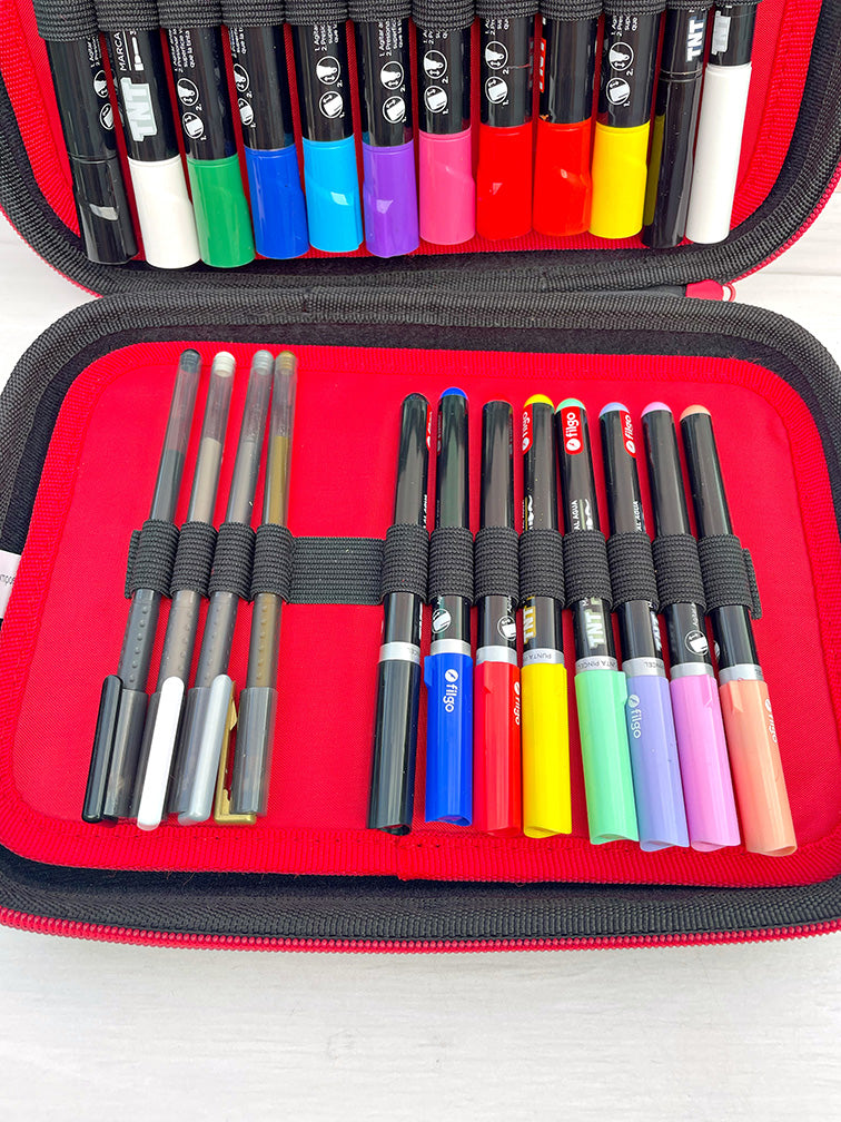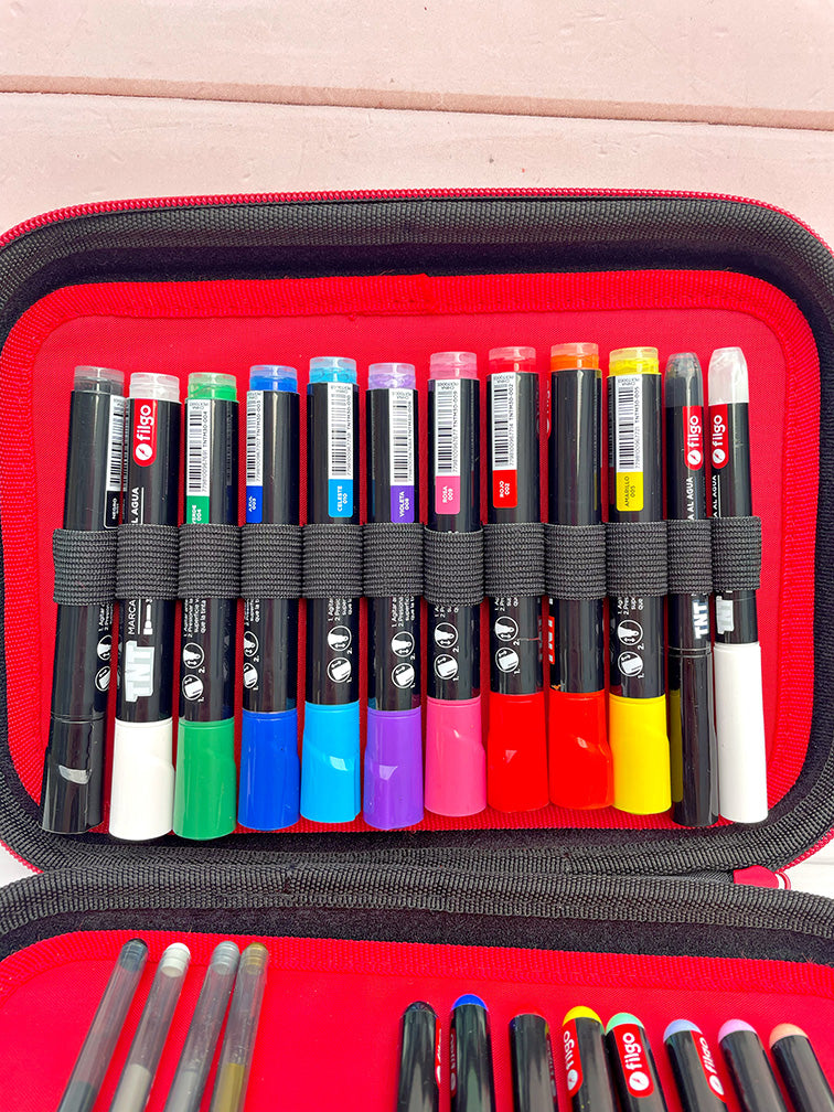 - Valijita organizadora con 24 piezas (lapiceras y marcadores) de tinta al agua y múltiples superficies.